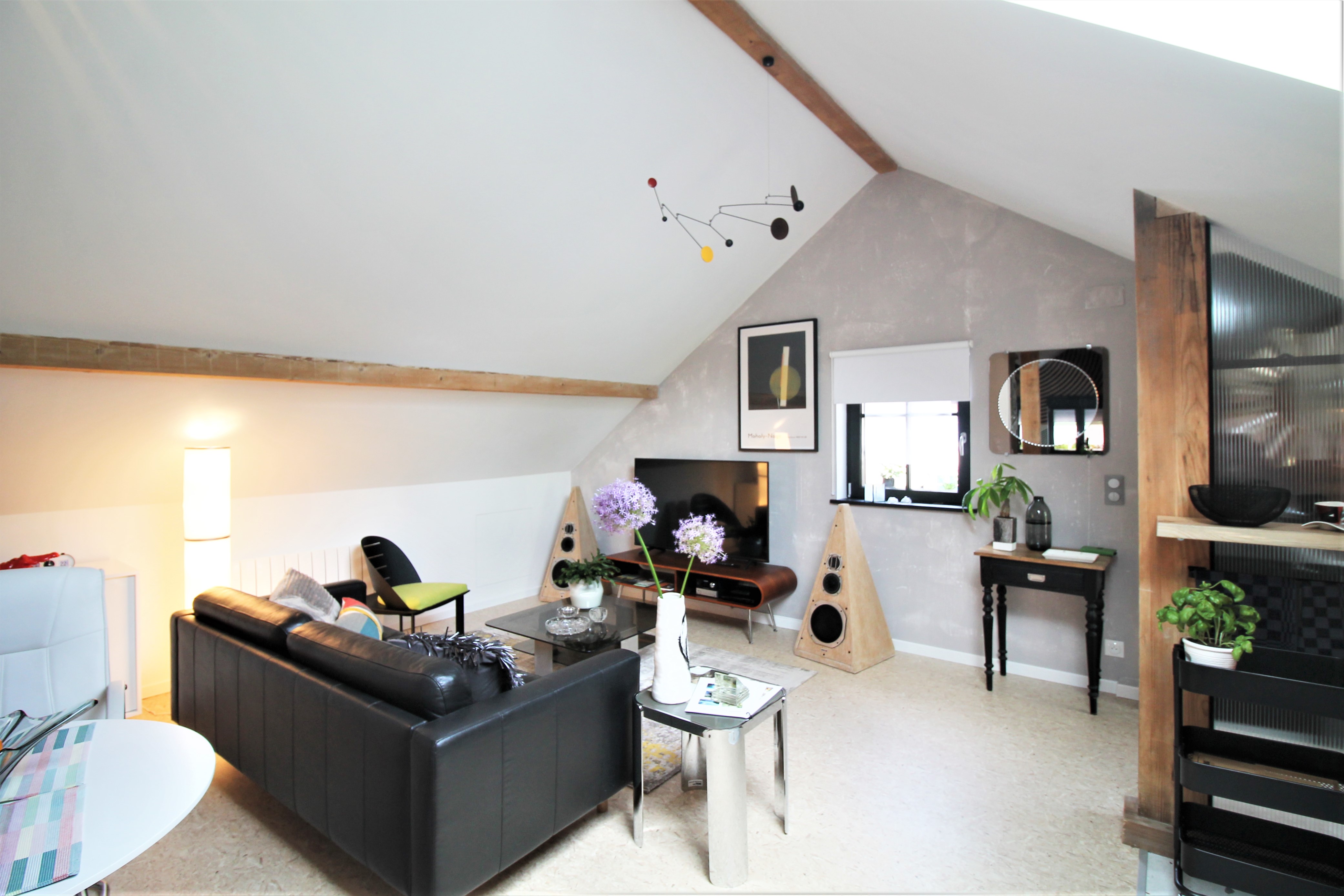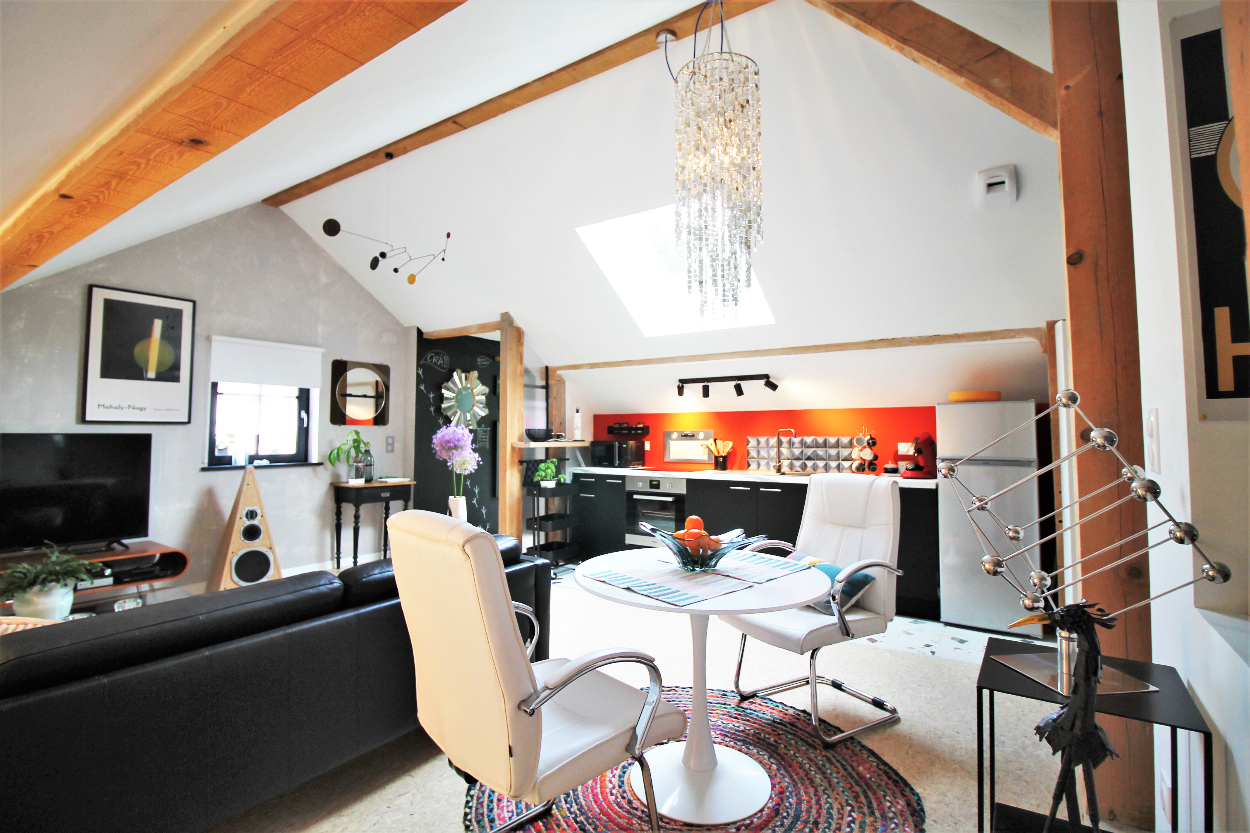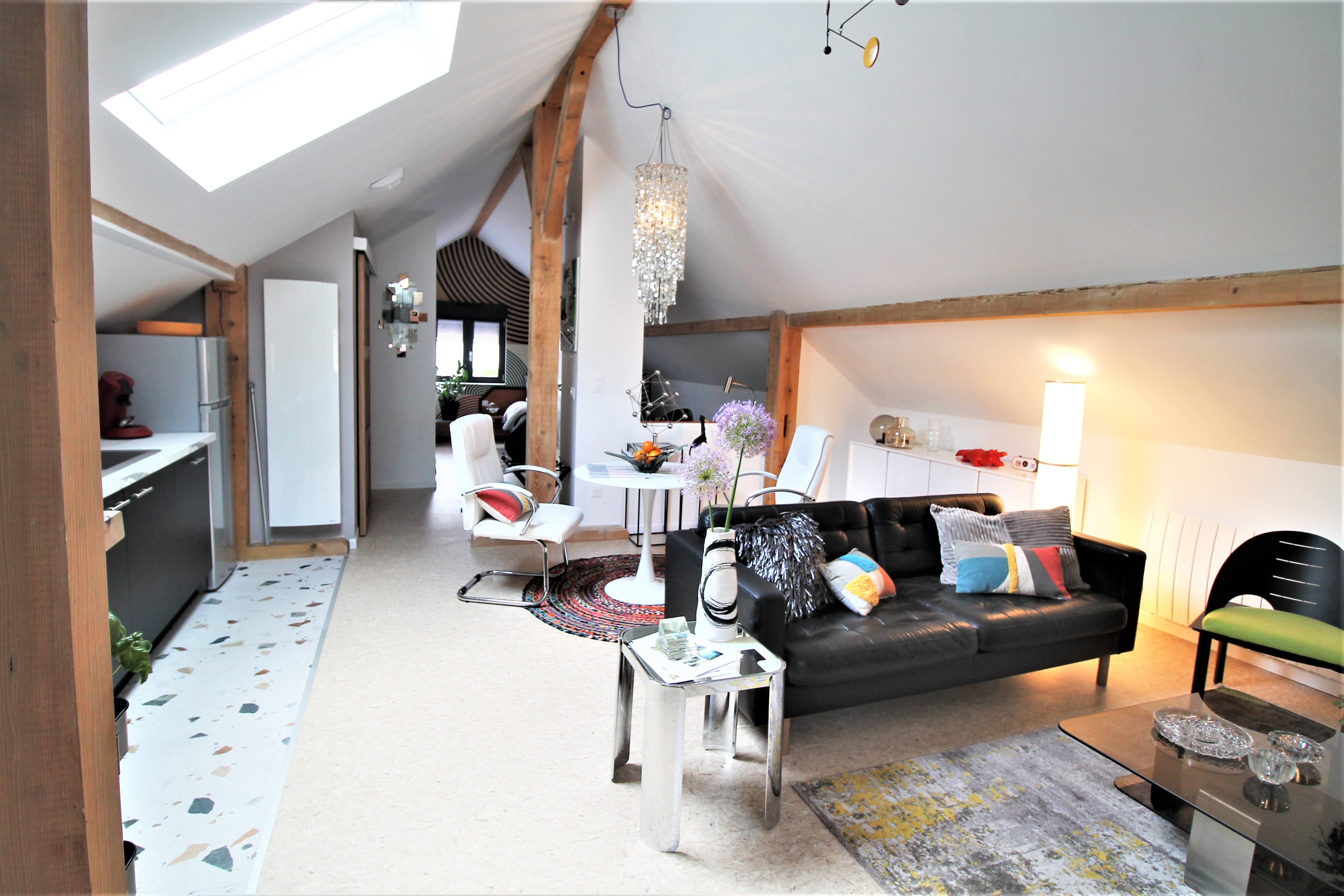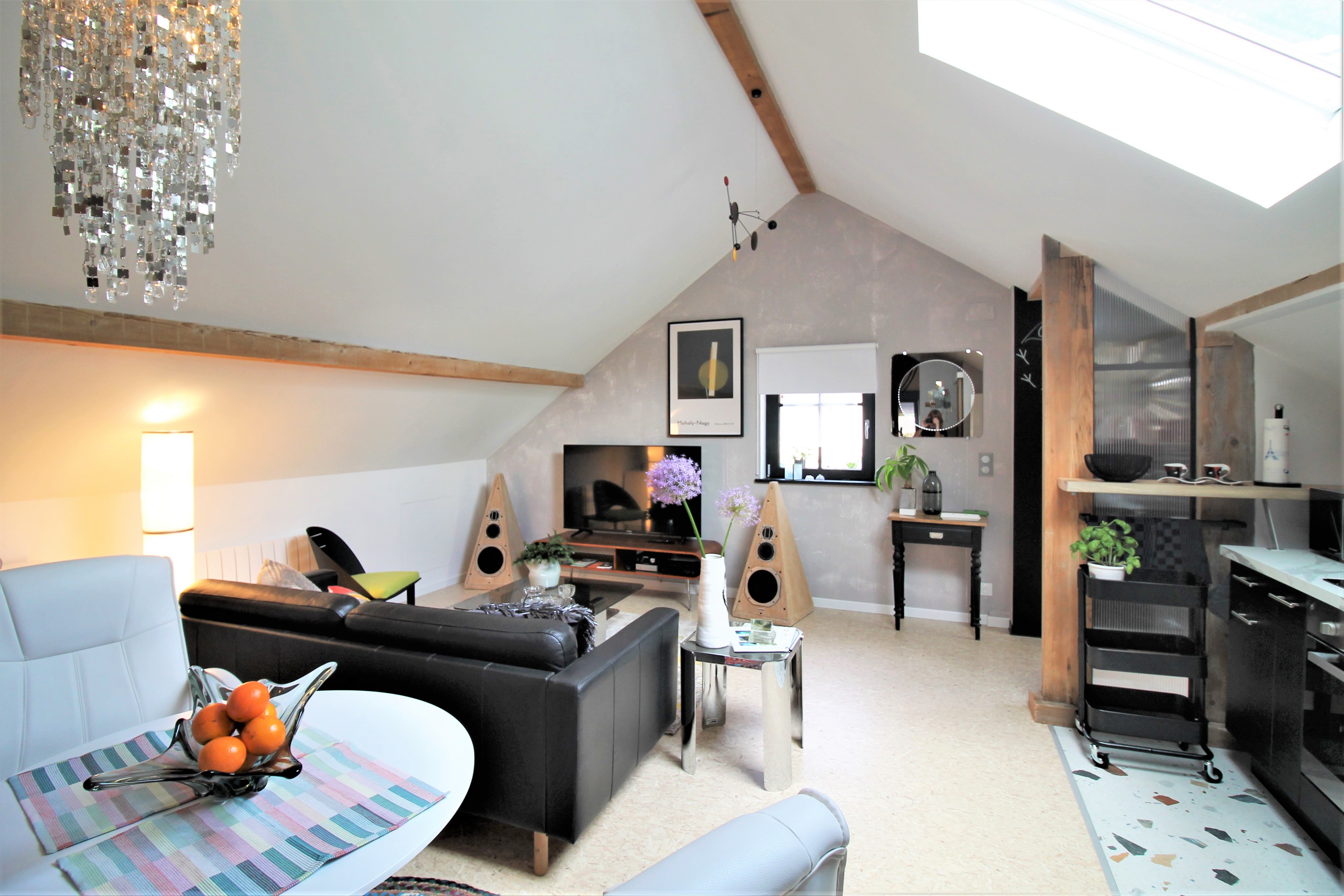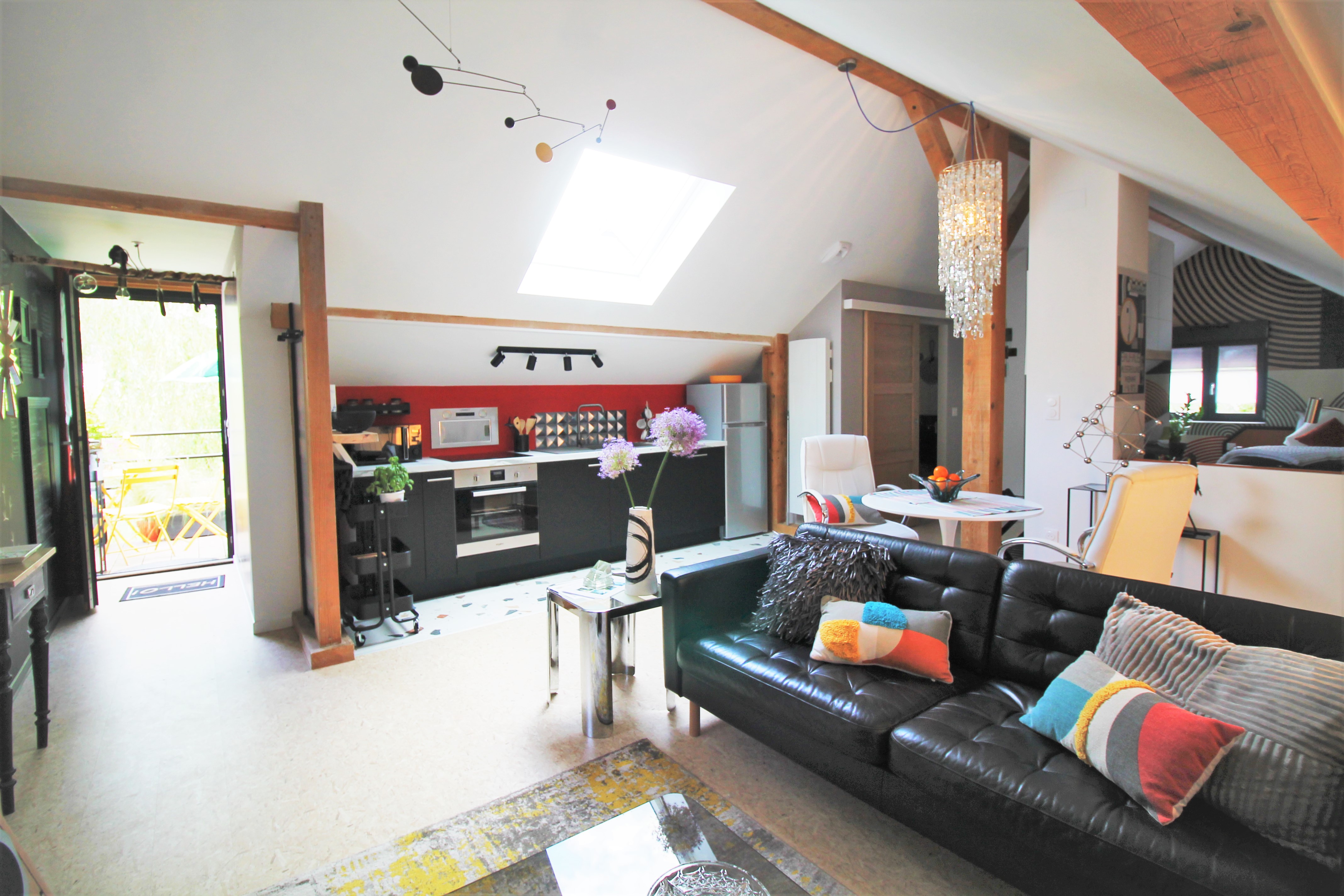 Un grand salon avec cuisine ouverte mène à une chambre équipée d’un lit 160, d’une petite bibliothèque avec coin lecture et bureau.
