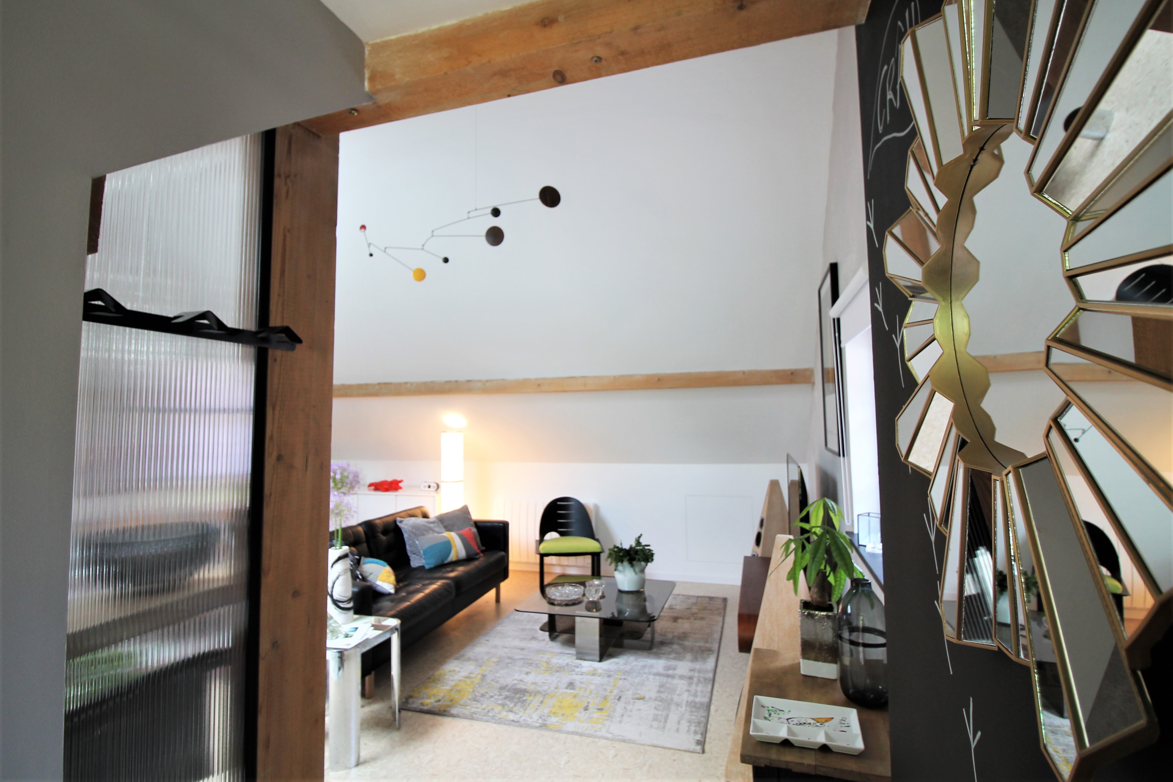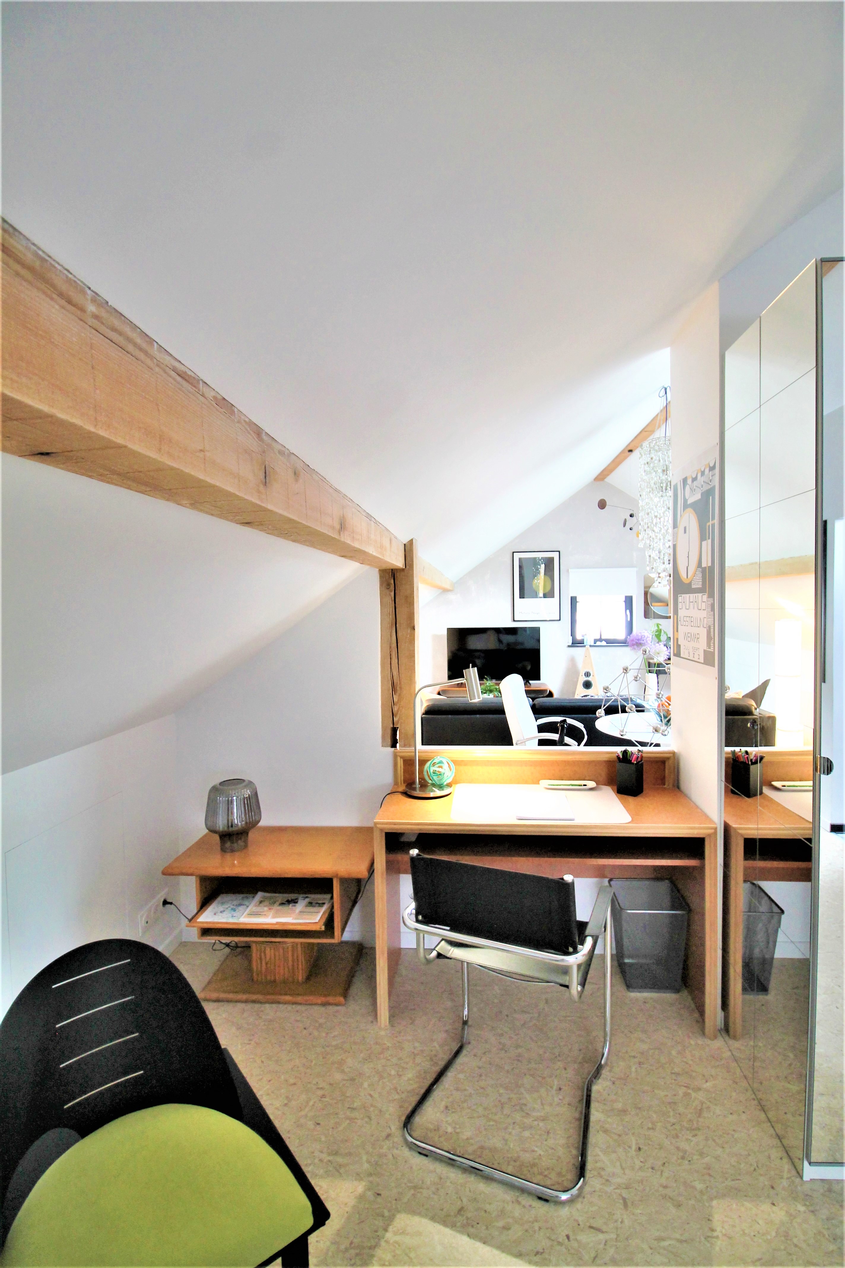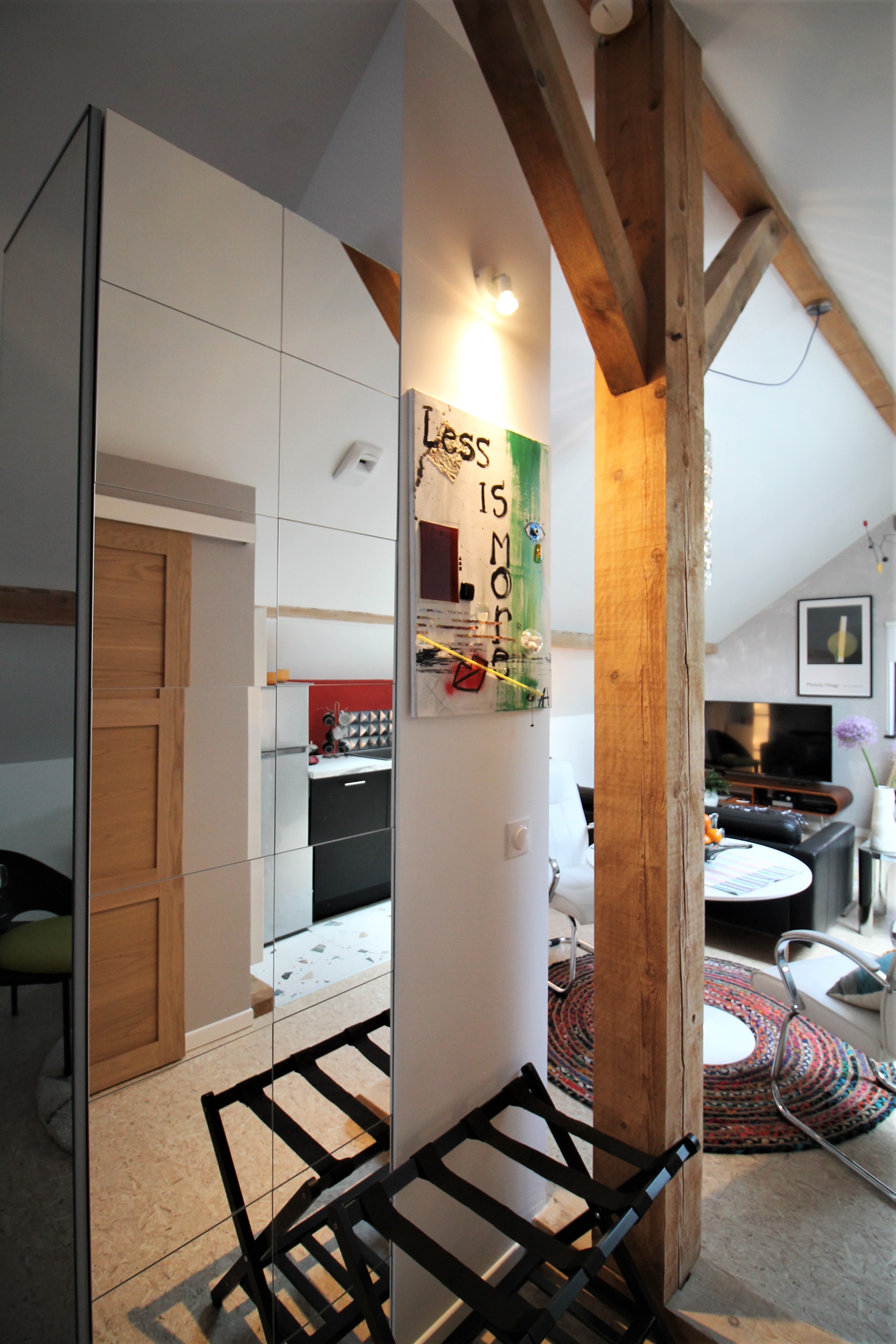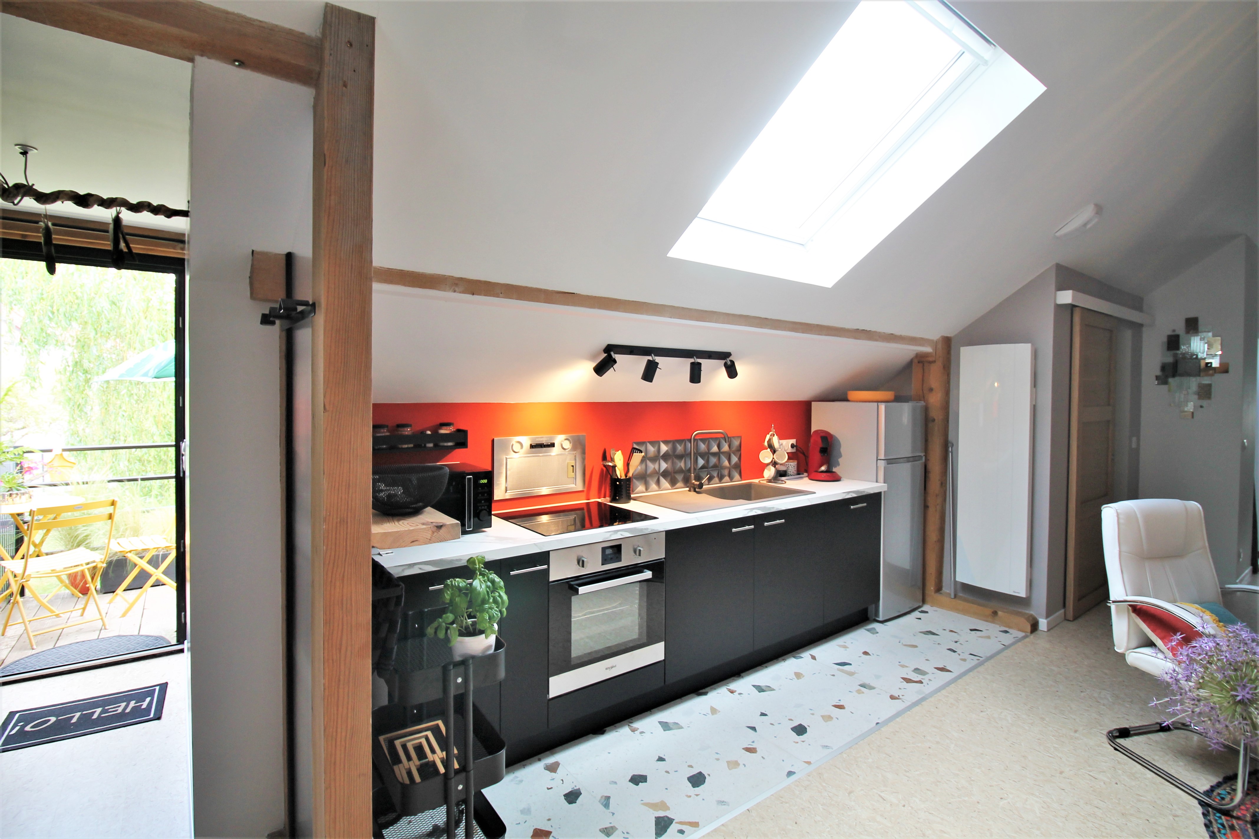 Un grand salon avec cuisine ouverte mène à une chambre équipée d’un lit 160, d’une petite bibliothèque avec coin lecture et bureau.
