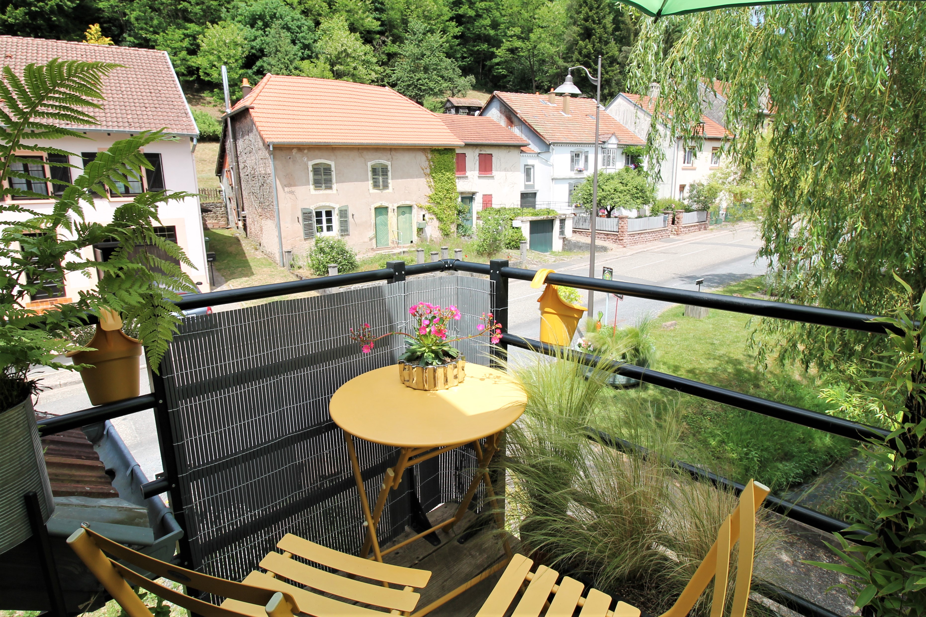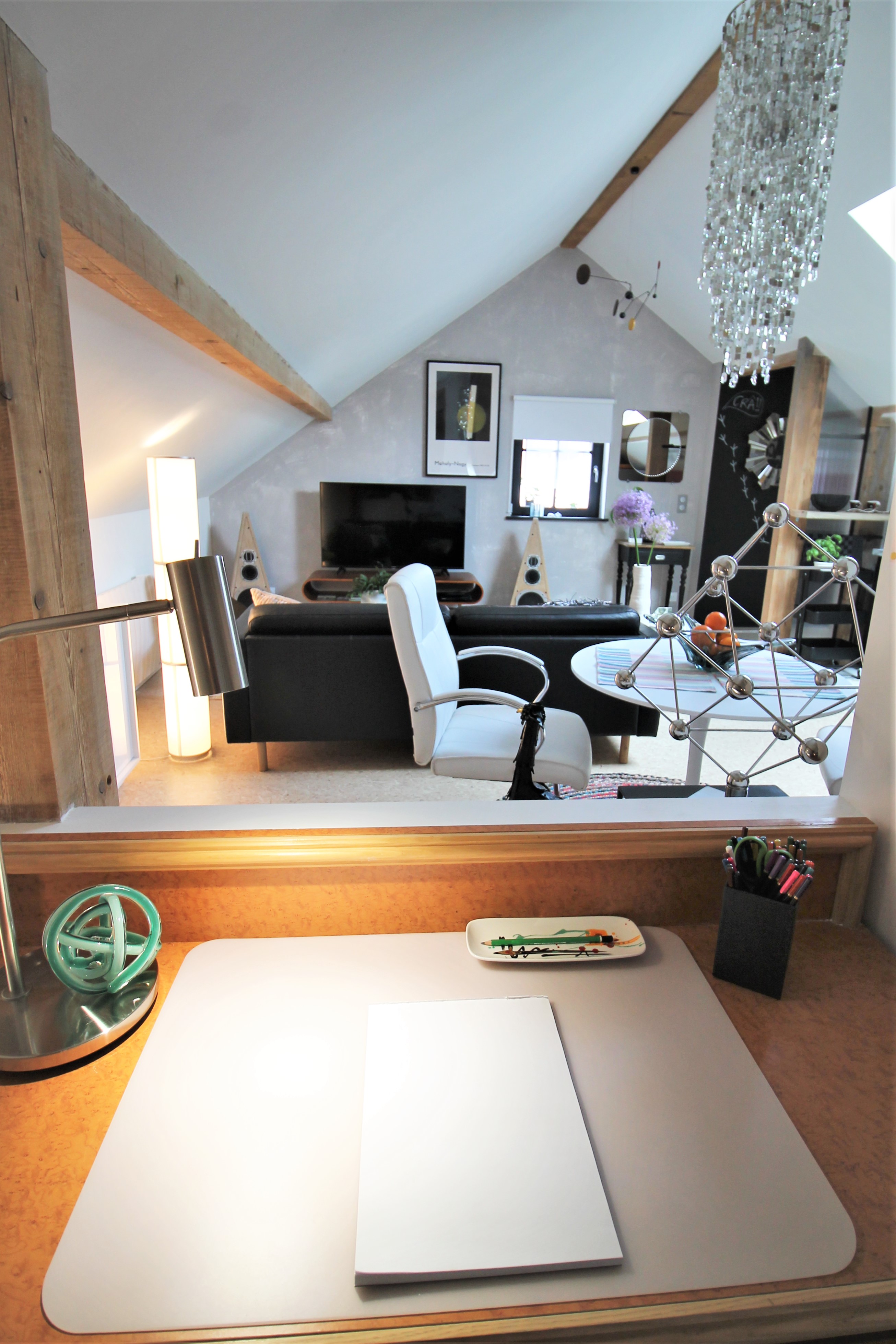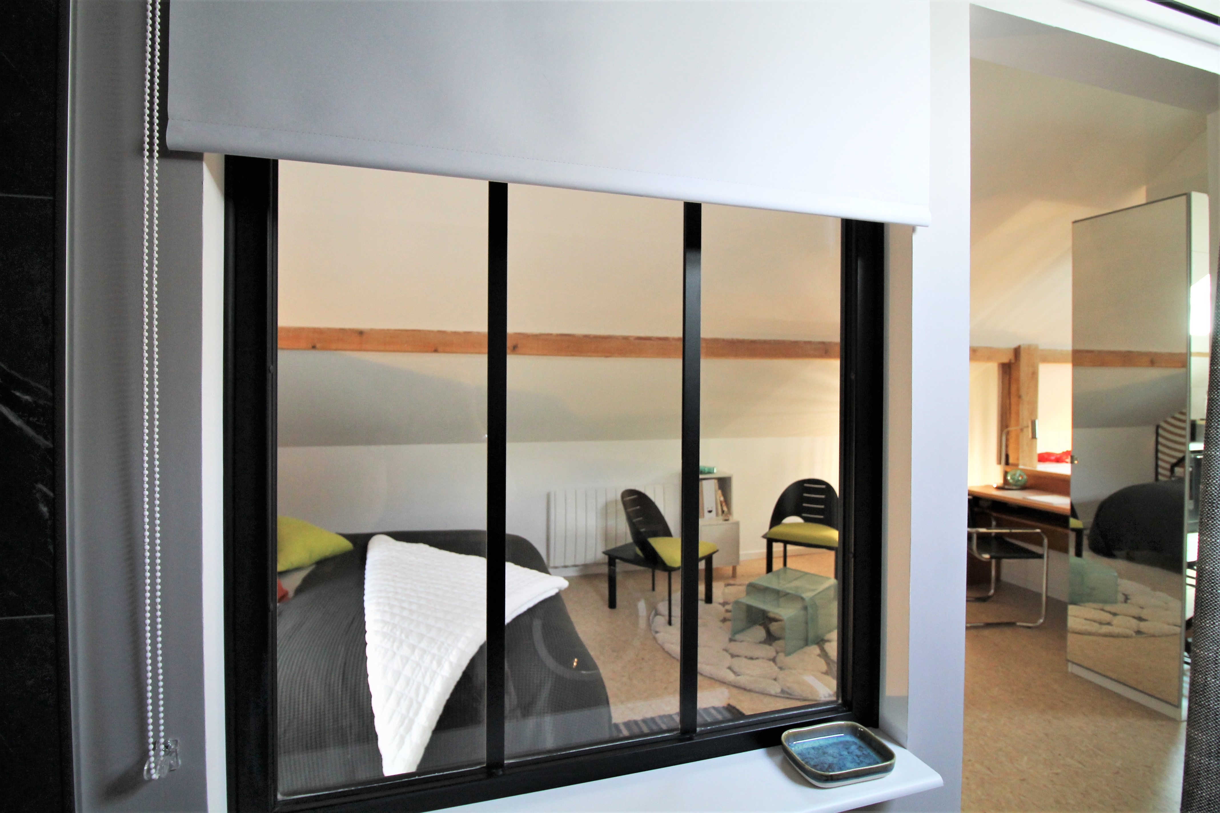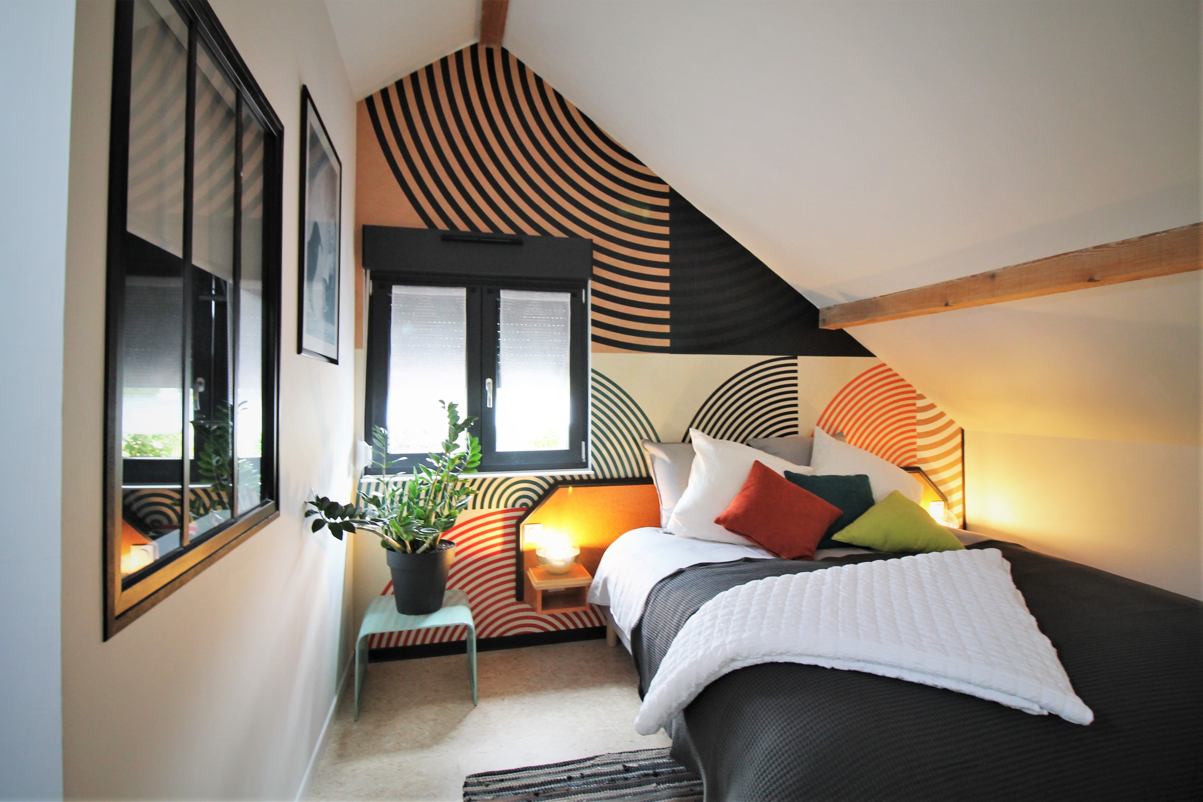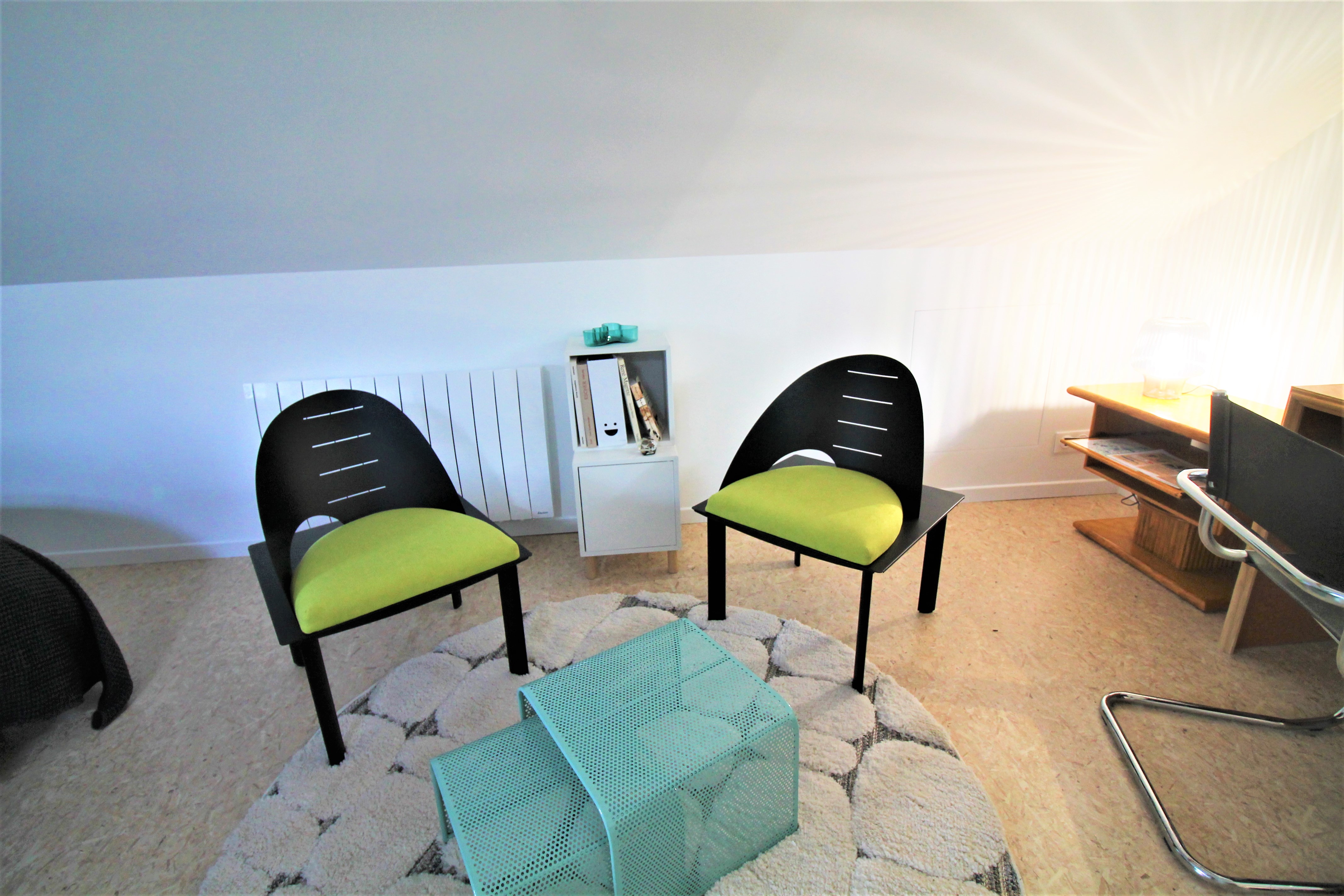 Un grand salon avec cuisine ouverte mène à une chambre équipée d’un lit 160, d’une petite bibliothèque avec coin lecture et bureau.