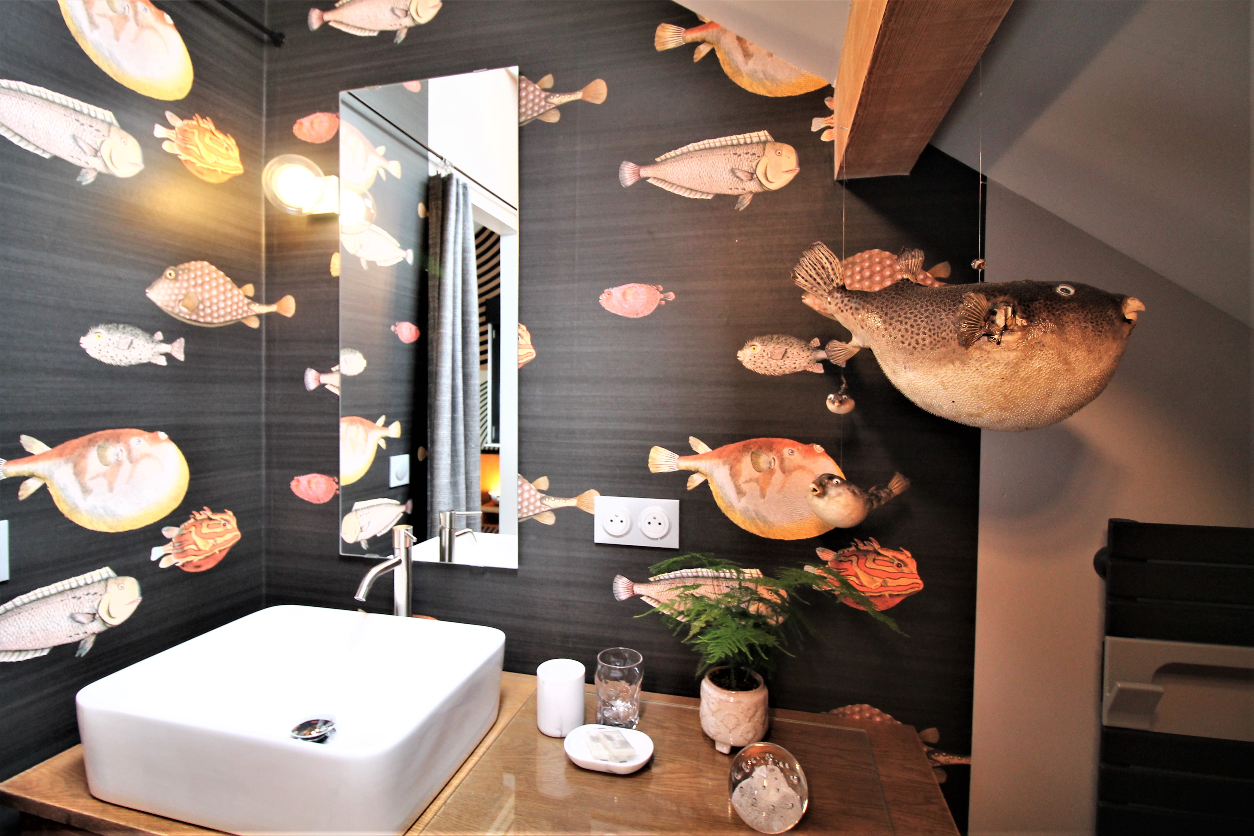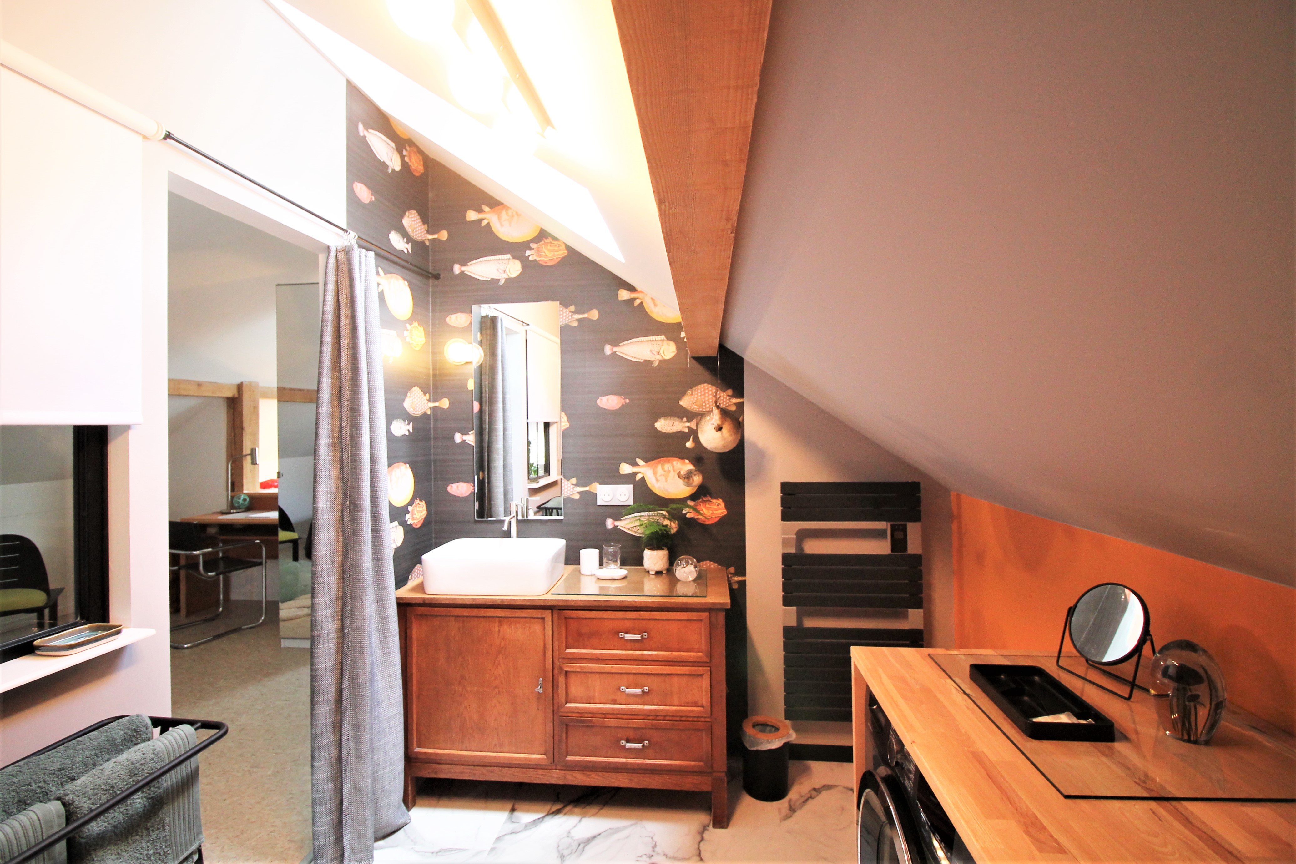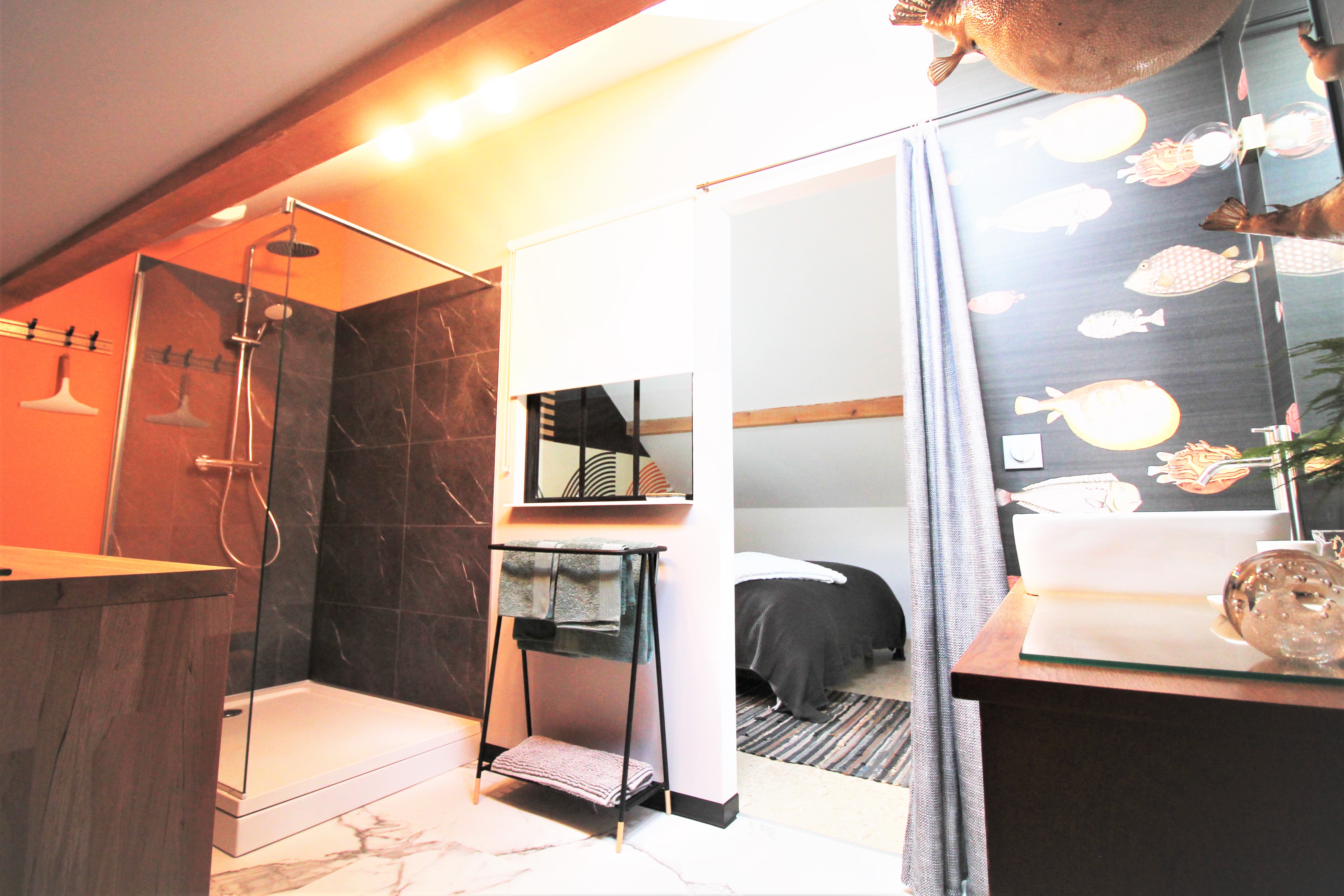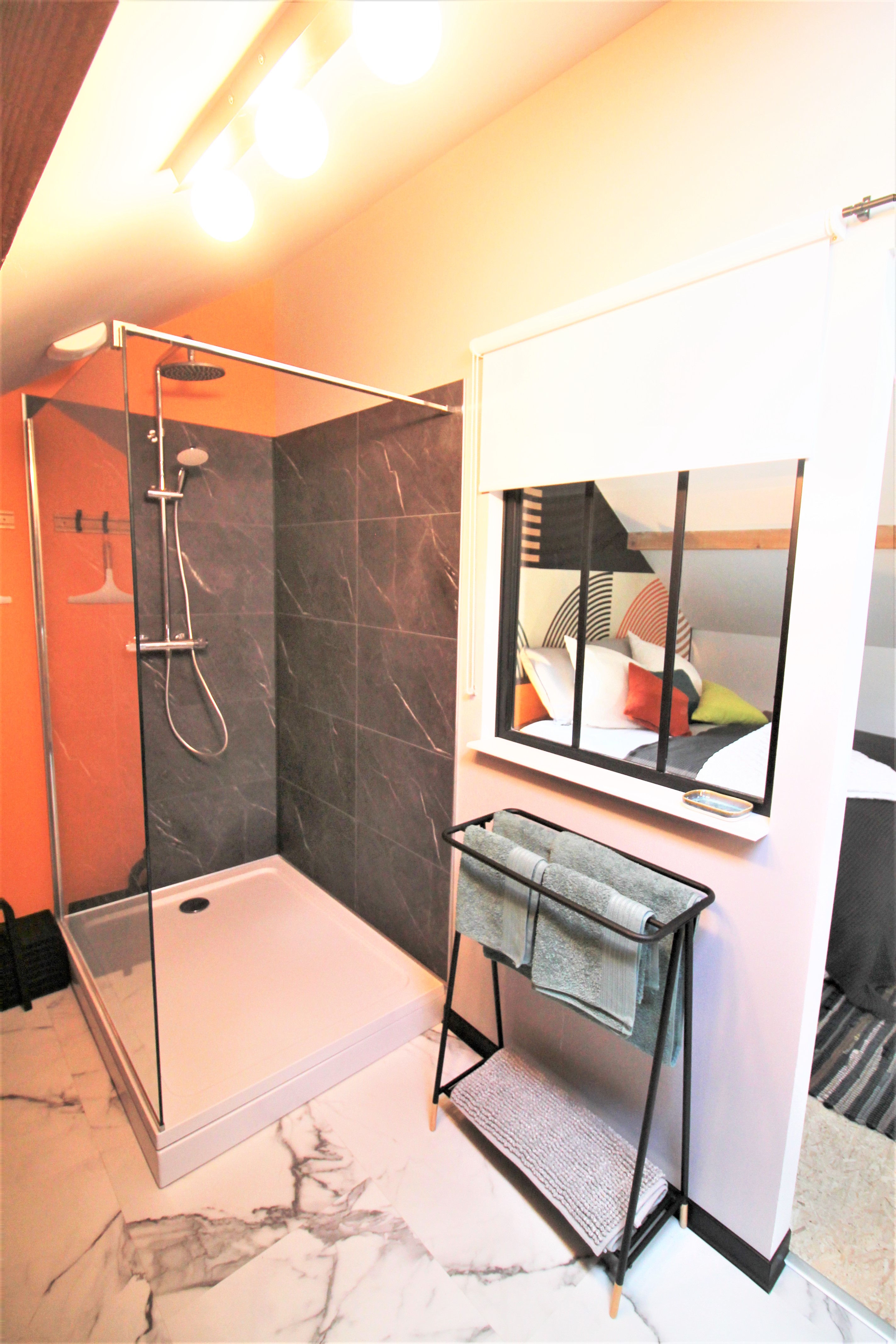 La salle de bains se compose d’une douche à l’italienne et d’une vasque, avec WC séparés.