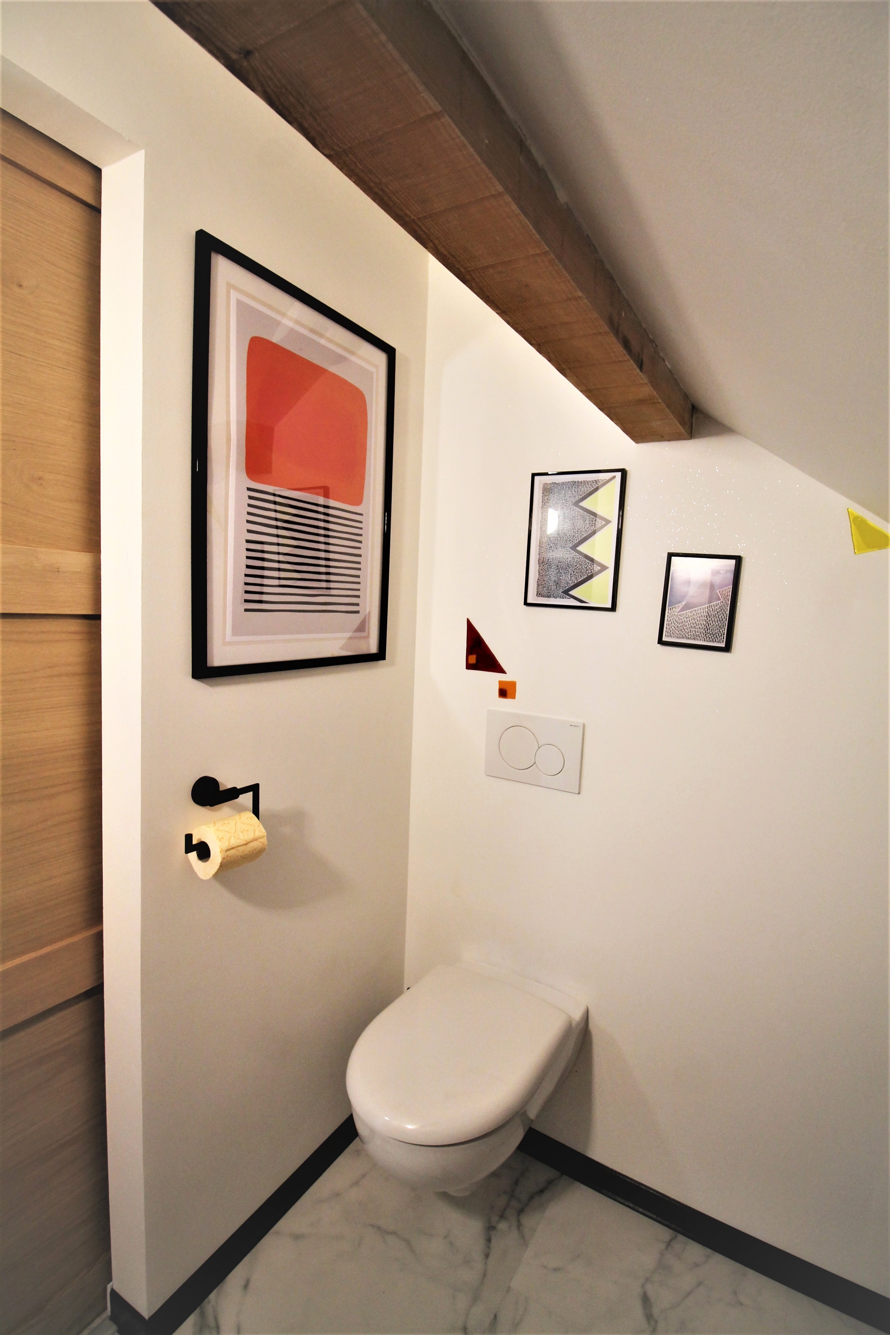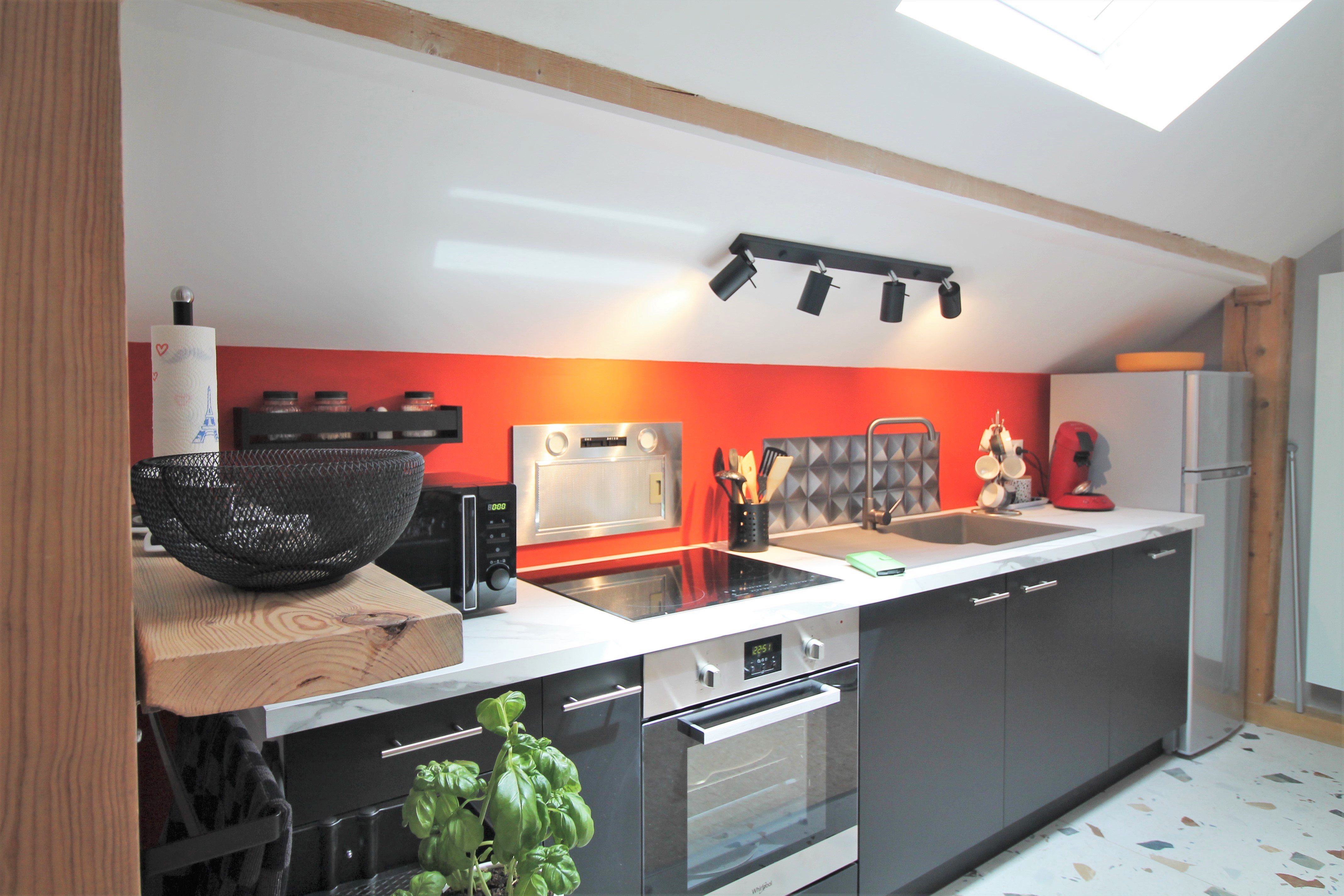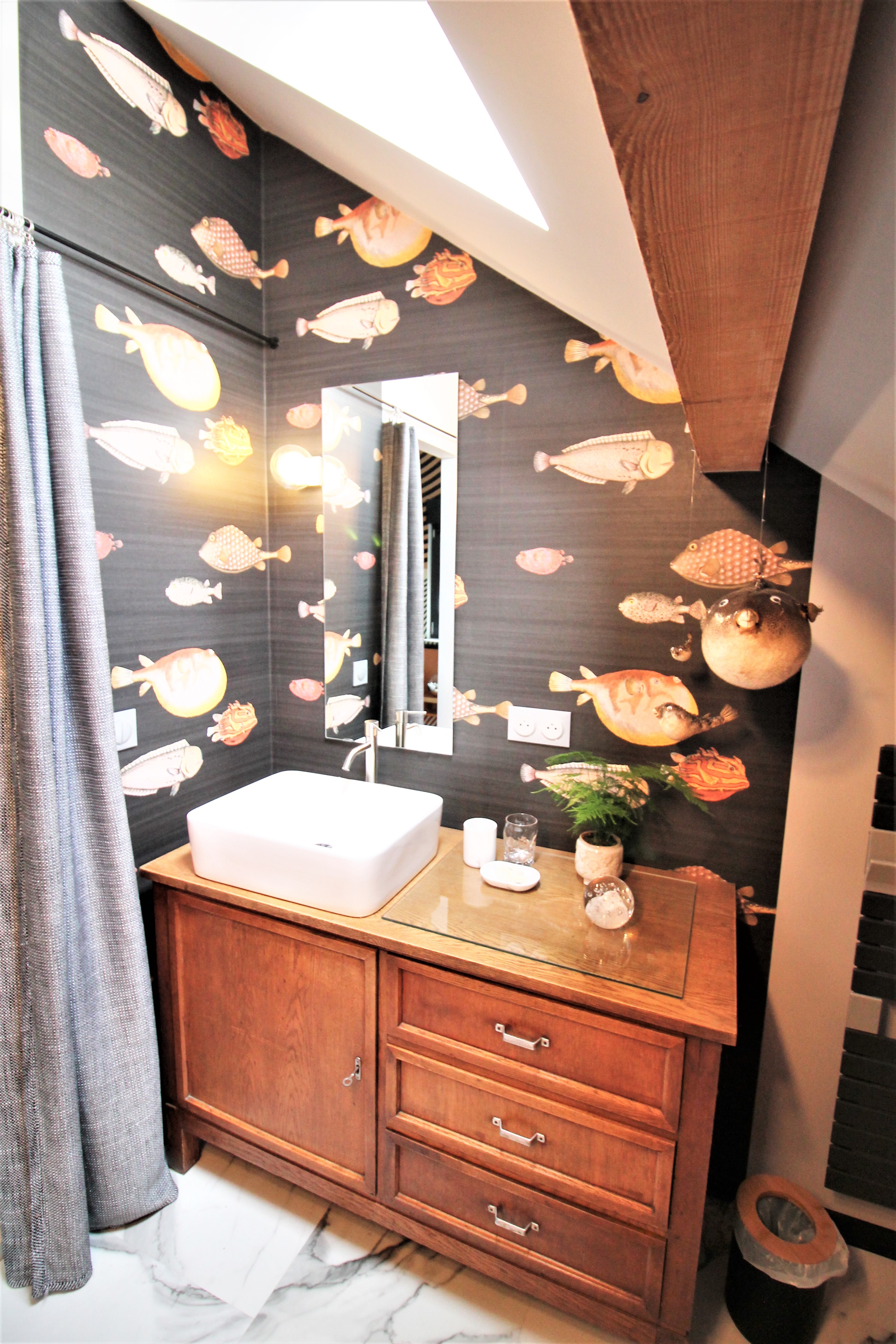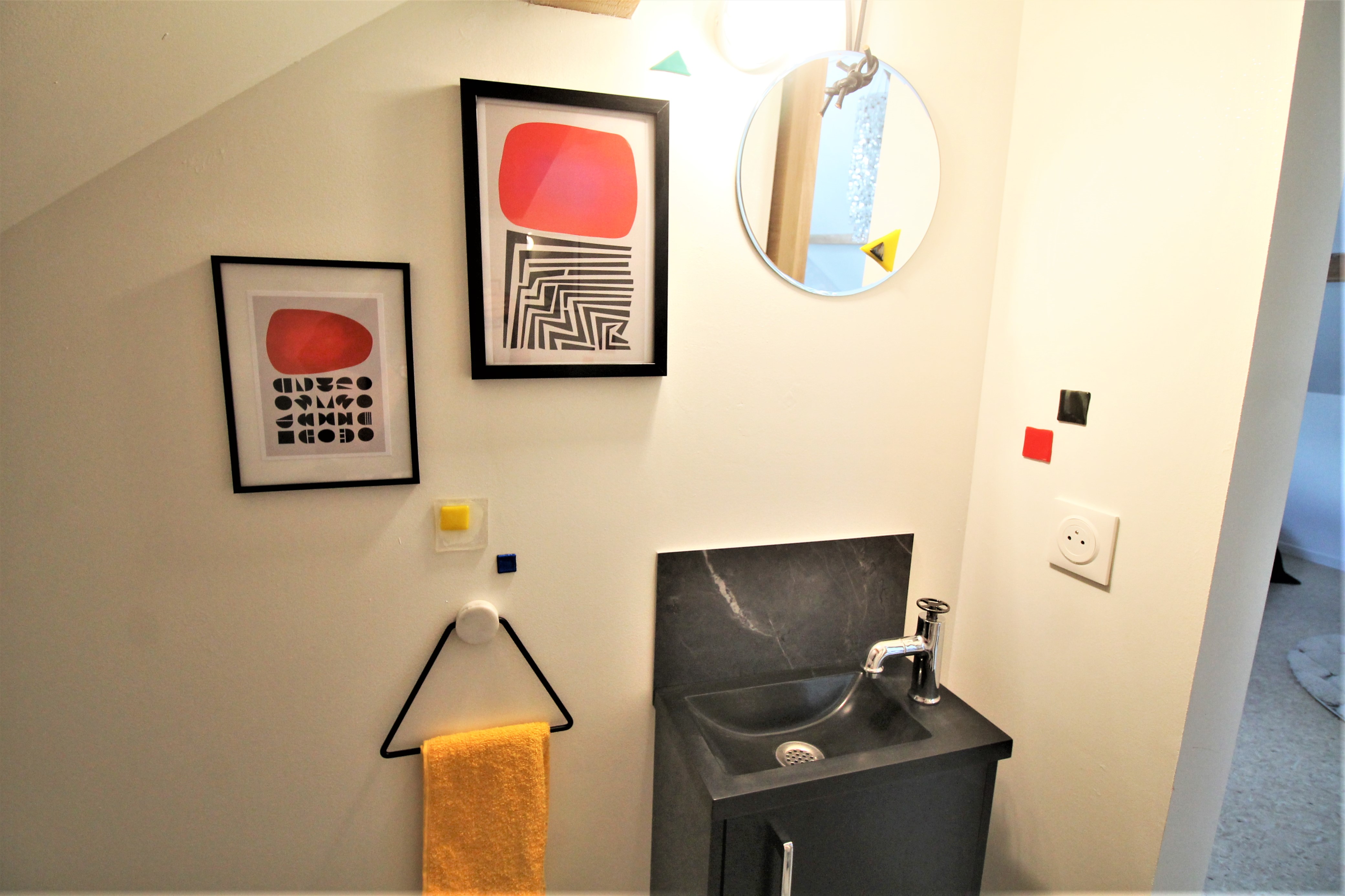 La salle de bains se compose d’une douche à l’italienne et d’une vasque, avec WC séparés.